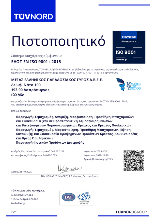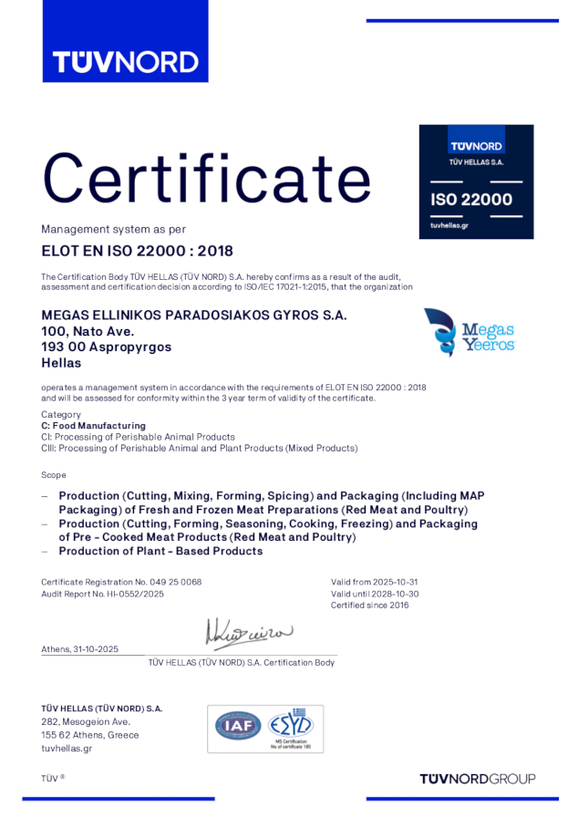 Με γνώμονες την ποιότητα, την καινοτομία και την διαρκή εξέλιξη σε όλο το φάσμα των δραστηριοτήτων της, η Megas Yeeros έχει πιστοποιηθεί από παγκόσμιους φορείς, προσφέροντας προϊόντα ανώτερης διατροφικής αξίας τόσο στην ελληνική όσο και τη διεθνή αγορά.